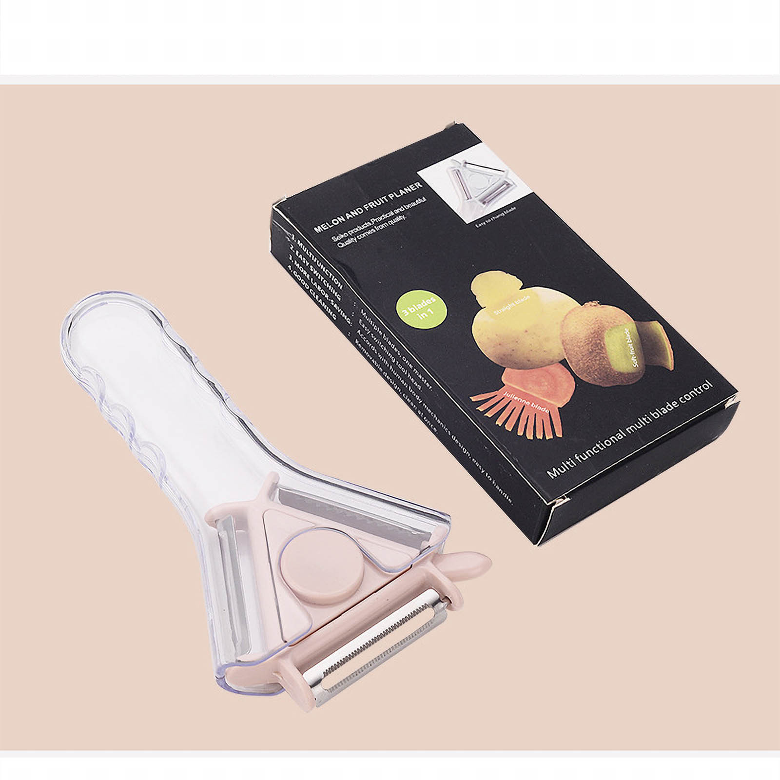 Avec cette accessoire multifonction, la cuisine devient une passion. Cet éplucheur est de nature rotatif. Il dispose de 3 lames différentes pour pouvoir éplucher, râper en julienne et trancher les légumes.